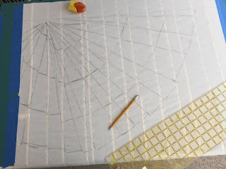 The design is then subdivided to determine which part of the construction we will attack. We decided upon the upper right hand portion of the quilt as the first part. The first part of the design was highlighted on the canvas both in pencil and with a fine tip Sharpie.