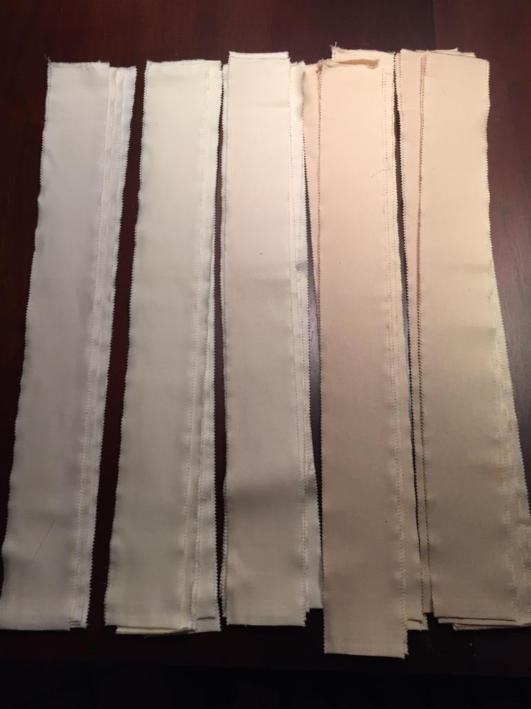 Our first task is to create our canvas. It is a canvas of strips of muslin; the strips are various sizes between just less than 1-inch and up to a bit more than 3-inches. In this case we are starting with 14 strips.