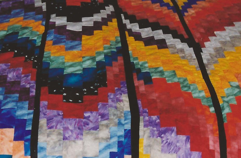 My apologies that I do not have the dimensions on hand, but I do remember designing this original Bargello-style quilt and wall hanging. And it had a ton of colors, albeit cotton fabric.